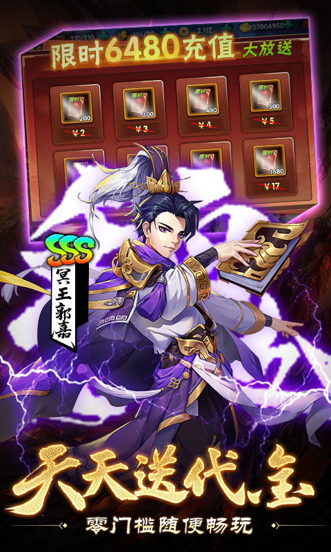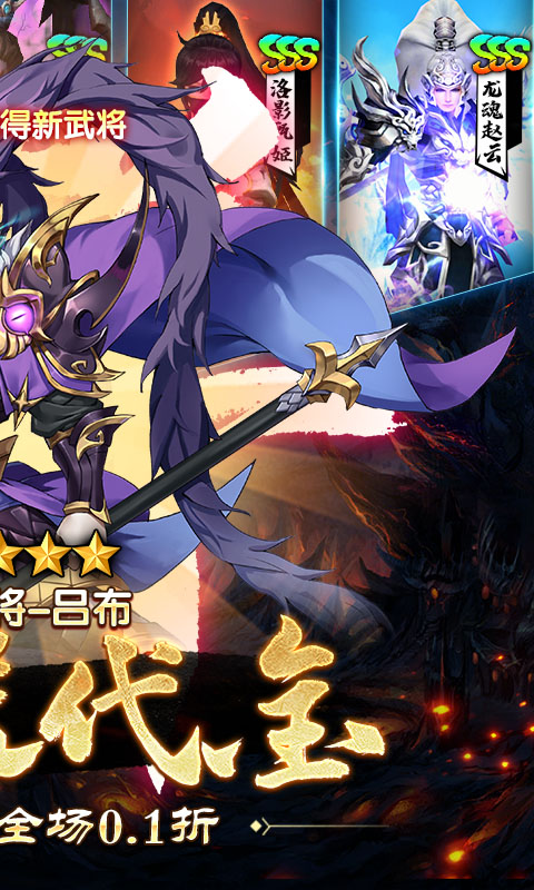 天天最高送6480代金券,全场充值0.1折!真正实现“免费玩游戏”,护好你的钱袋子,更护好你的肝。精美丝滑的战斗画面、超高抽卡概率,让你轻松收集三国名将,开启零负担的王者征程。