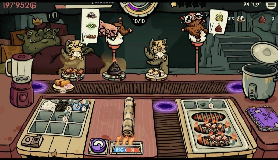 《哥布林寿司》将策略与管理元素巧妙结合,玩家需要通过合理分配资源和时间,有效组织哥布林们的工作。在限时的情况下,你需要升级餐厅的设施,扩展菜单选项,挑选最优质的食材来制作寿司。每一种寿司都有其独特的配方和制作方式,玩家需要合理安排,每一次出餐都要力求完美,以获得顾客的好评和更高的收益。