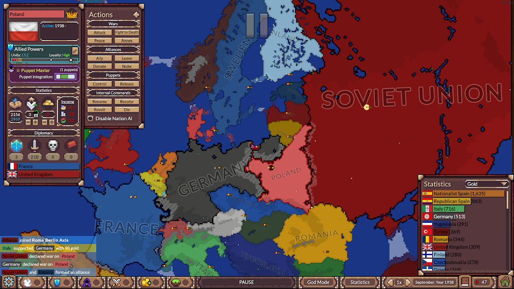 《战争年代》不仅仅是一款战争游戏,更是一个复杂的策略平台。游戏内包含众多国家,每个国家拥有独立的经济、军事和政治属性。在游玩过程中,可以观察各国之间的联盟形成、叛乱爆发、傀儡政权出现和国家内部政治动荡。玩家通过操控或者观察这些国家的行动,了解战争背后的多层次策略关系。战争的爆发往往牵涉到外交谈判、资源争夺与盟友支持,展现了极其真实而丰富的国际关系动态。