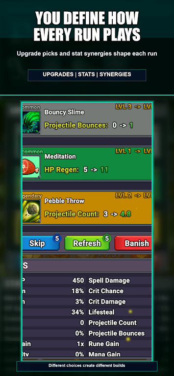 游戏中共有15位各具特色的英雄等待解锁,每位英雄拥有自己专属的18种法术技能。玩家可以根据战斗需求灵活搭配,打造专属的技能组合。随着游戏进度的开展,还能收集约57种不同的装备和道具,经由锻造系统强化和合成,打造出更强力的战斗辅助工具。多样的组合方式与协同效果,不仅提升了角色的战斗力,也增加了游戏策略的多样性和深度。