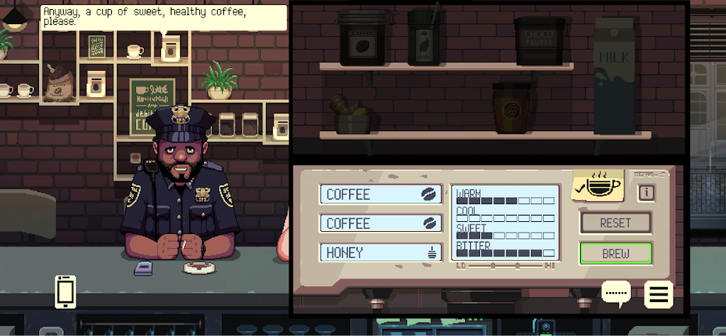 咖啡闲聊最为独特的部分在于体验“倾听”的力量。玩家扮演一名咖啡师,日常任务不仅仅是调制各种暖饮,更重要的是倾听来到咖啡厅的顾客们诉说他们的烦恼和故事。游戏中会根据手头现有的食材,为每位顾客制作专属的暖饮。这种“定制咖啡”不仅是安慰的象征,也体现了对顾客情绪细致入微的理解。通过每一次交流和调饮,玩家不仅帮助角色们寻找情感的出口,也逐渐揭开他们背后更深层的故事和秘密。
