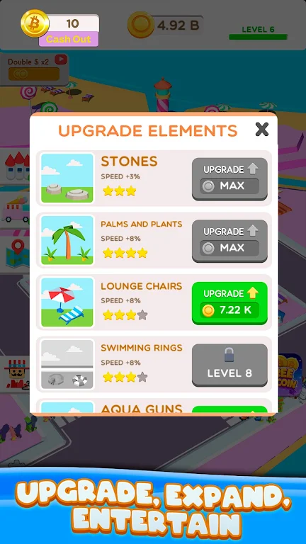 比特币水上乐园特别适合喜欢经营模拟和闲置游戏的玩家。游戏融合了建设、升级和策略管理多重元素,带来深度且富有成就感的游戏体验。从最初的小型滑梯到最终的欢乐水世界,玩家能够清晰看到自己经营成果的不断提升。无论是短暂放松还是沉浸式长时间游玩,乐园都会根据你的投入成长,满足你对创意、公园设计和商业发展的多重需求,实现打造梦想水上乐园帝国的壮志。