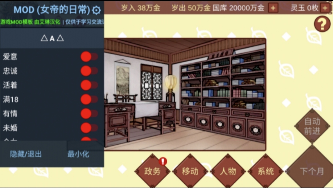 《女帝的日常超全捏脸版(中文辅助菜单)》是一款深刻还原古代帝王生活的模拟经营手游,玩家将在游戏中扮演英明而坚韧的开国女帝。从即位那一刻起,你的使命便是将满目疮痍的国家带向繁荣昌盛,体验一个真实且细腻的帝王养成过程。