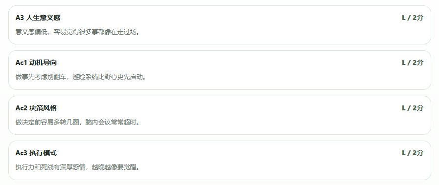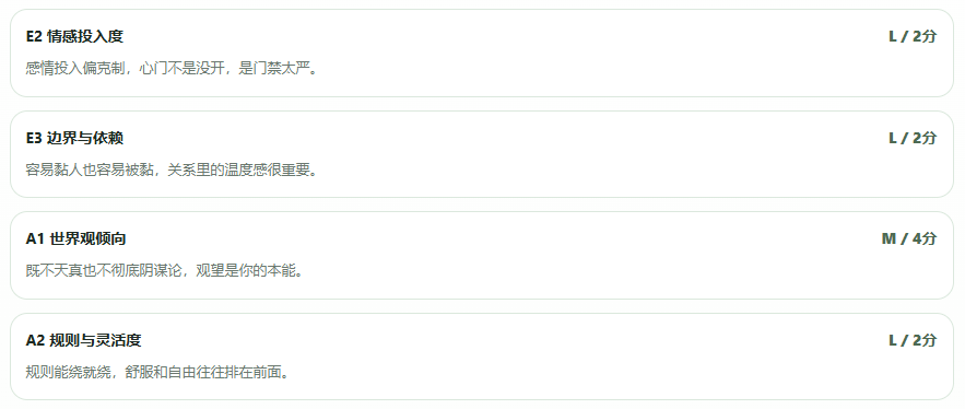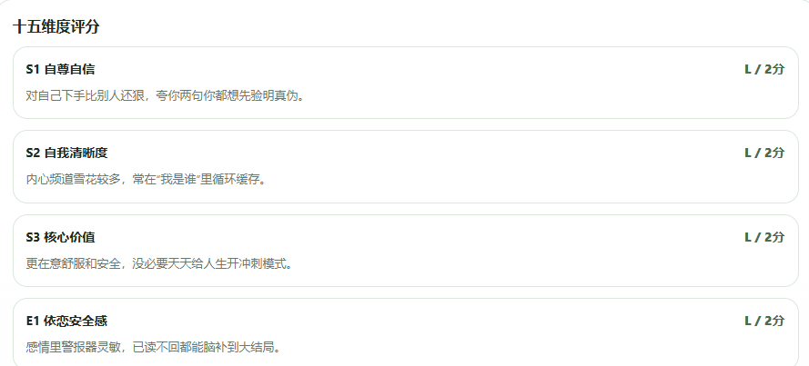 不同于传统人格测试单一维度的划分,SBTI人格测试建立了多维度的人格模型。该模型包含认知风格、情绪管理、社交方式、决策习惯等多个维度,全面解析个体行为背后的心理机制。通过这些维度的叠加组合,SBTI人格测试能够精准描绘每位玩家独特的人格画像,帮助用户更好地理解自我优势与短板。