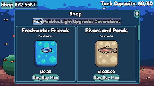 轻松水族馆(Steam移植)是一款专为喜欢放松与养成的玩家设计的放置类游戏。游戏以真实时间为基础,结合轻松愉快的养鱼体验,让玩家能够在闲暇时光中打造属于自己的梦幻水族馆。玩家购买各式各样的可爱鱼苗,随着时间推移细心养育,最终将它们卖出换取金币。游戏中从简朴的起始水族箱开始,逐步解锁更多奇异且珍稀的鱼类,打造出个性鲜明的水族空间。