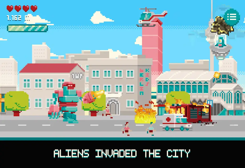 机械巨兽不仅是一台战斗机器,更是城市中的破坏之神。打破阻挡道路的各种建筑,摧毁沿路的载具和机械,玩家可以在游戏中尽情释放力量,制造一场前所未有的混乱狂潮。城市风貌栩栩如生,像素艺术的表现细腻精致,每一次攻击和爆炸都带来震撼视听效果,让人仿佛回到街机游戏厅的热血时光。