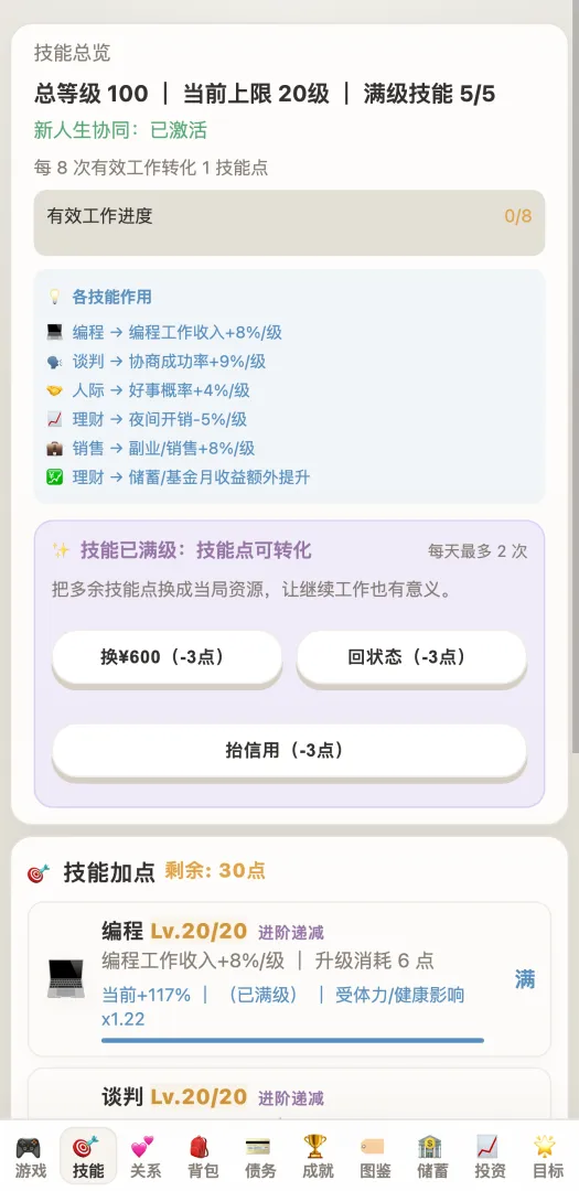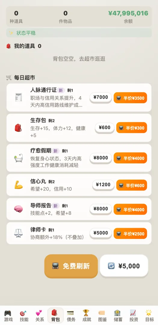游戏内容按照时间和阶段分为三大部分。初期,你的首要任务是“活下来”,避免陷入更深的债务泥潭。你需要稳定基本开支,避免信用彻底崩溃。中期阶段,负产阶级鼓励玩家寻找适合自己的“翻身”策略,譬如技能转型、创业尝试或者债务重组,通过逐渐提升自身价值和经济状况,逐步减少负债。到了后期,当债务清偿完毕,游戏则引导你进入一个全新的发展阶段,开启储蓄、理财、投资和资产配置等更加成熟的财富管理玩法,帮助你规划尚未完成的人生目标。