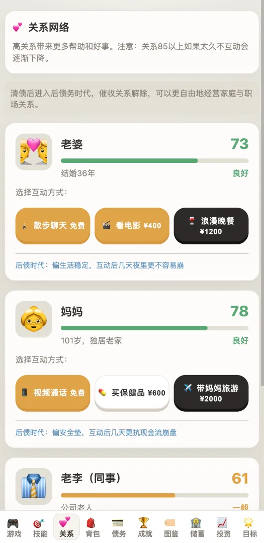 负产阶级拒绝简单的升值赚金币模式。这里的成长不是枯燥的数值叠加,而是对现实人生的一种模拟和探索。你需要在现实压力与自身价值之间寻找突破口,照顾好自己和身边人的情绪,处理复杂的人际关系,避免生活的重压将你彻底击倒。游戏设计注重细节,诸如身体健康的维护、心理调适、亲情友情的经营等,都是现实中不可或缺的生存技能。
