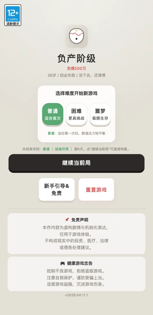 负产阶级是一款深刻反映现代负债生活的生存经营游戏,带你体验一个普通人在债务压力下,如何一步步撑过难关,重新找回生活节奏的真实历程。游戏没有华丽的虚构设定,而是直面现实中的每一笔欠款、每一次疲惫,和那挥之不去的失眠焦虑。在这里,你的目标不是简单地赚取金钱数字,而是在债务、健康、情绪与人际关系之间找到平衡,慢慢走出困境。