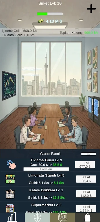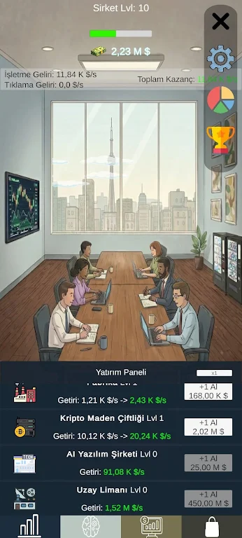 随着财富积累,你可以使用赚取的资金提升CEO技能。每项技能都有独特效果,比如提升点击收益、缩短时间加速、举办营销活动提升公司声誉等。合理分配技能点,针对自身游戏风格培养最适合的领导力,让收益效率最大化。