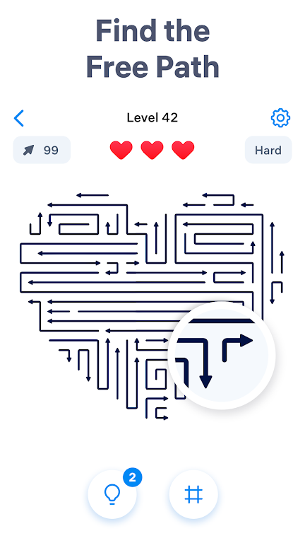 《箭头拼图》为解决可能遇到的难题特别设计了提示系统,当遇到瓶颈或不确定下一步时,玩家可以随时使用提示。提示会详细展示当前可以安全点击的箭头,帮助玩家理清思路,避免无效尝试带来的生命损失。合理利用提示功能,能够避免游戏过程中过度挫败,增强玩家玩游戏的乐趣和成就感。