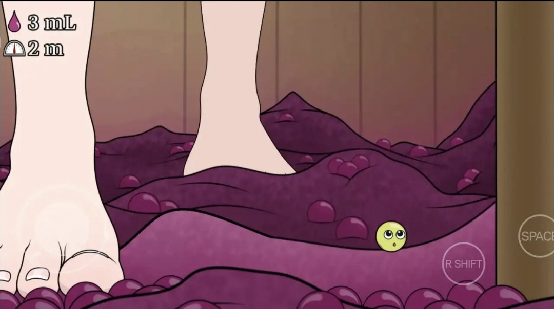 在一个阳光明媚的果园里,一颗活泼的小葡萄意外地被装进了酿酒桶。这个桶里不仅空间狭小,而且不断有试图把你踩扁的女孩的脚在桶口上下移动。你必须依靠自己的灵活和智慧,在桶内不断滚动,躲避危险,同时寻找机会深入桶的最底部。