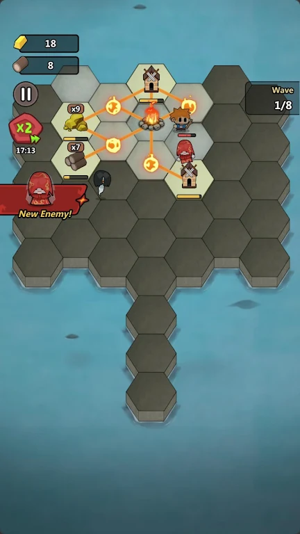 《英雄要塞》是一款创新的塔防策略游戏,彻底颠覆了传统的防御塔模式。在这款游戏中,玩家不再只是简单地建造防御建筑抵挡敌军,而是通过将资源建筑与篝火相连接,自动生成并组建军队,实时防御源源不断袭来的怪物。资源建筑包括锯木厂、金矿等,它们不仅生产资源,更是士兵的来源。玩家需要合理规划这些资源节点与篝火的连接线路,确保稳定的兵力生成,以便在每一波怪物来袭时都能守护营地安全。