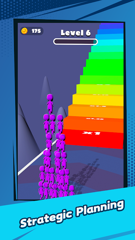 在《人群战斗》中,玩家通过简单的左滑或右滑操作来选择最佳面板。每当你的角色触碰到面板时,后方的人群数量就会增加。面对敌人,你的目标是确保到达终点线时你的人群数量超过他们。如果你的数量未能胜过敌人,游戏将以失败告终。这种机制带来了紧张刺激的对决体验,让玩家在每一场战斗中都需全力以赴。