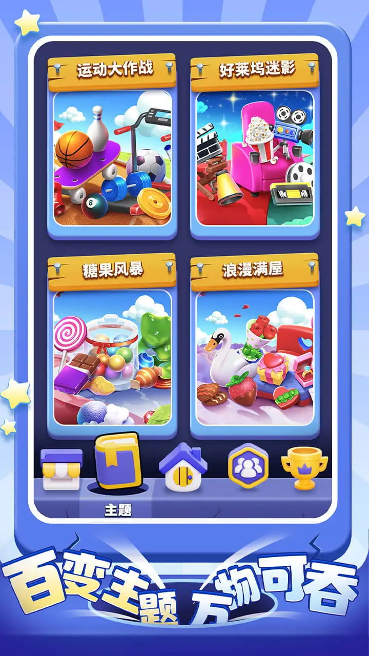 游戏设置了多个风格迥异的关卡。从繁华城市到宁静的乡村,再到神秘的山脉,每个关卡都有其独特的挑战和趣味。随着关卡的推进,难度逐渐增加,玩家需要更灵活的操作和策略,才能成功吞噬所有目标。每一个关卡不仅考验反应能力,更能激发创造力。