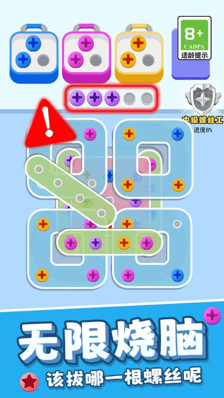 在《解螺丝》中,玩家将面对各种各样的任务。每个关卡都有不同的挑战,有的需要精准地打入螺丝,有的则要求你快速有效地拔出钉子。游戏提供了丰富的场景设计,从简单的小工具箱到复杂的机械装置,每个关卡都带来新的体验,确保玩家不会感到厌倦。