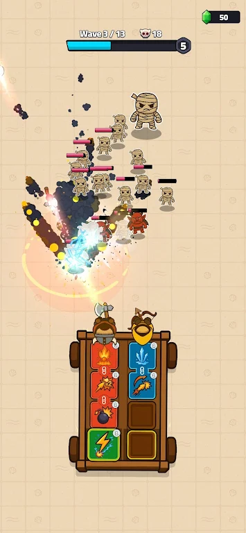 面对敌群时,巧妙的技能搭配能够带来意想不到的战斗效果。例如,使用“火焰”技能后紧接着使用“爆炸”技能,可以造成“燃烧爆炸”的强力效果。每位英雄最多可以使用四种技能,玩家需要根据不同的战斗场景灵活配置,创造毁灭性的连击。