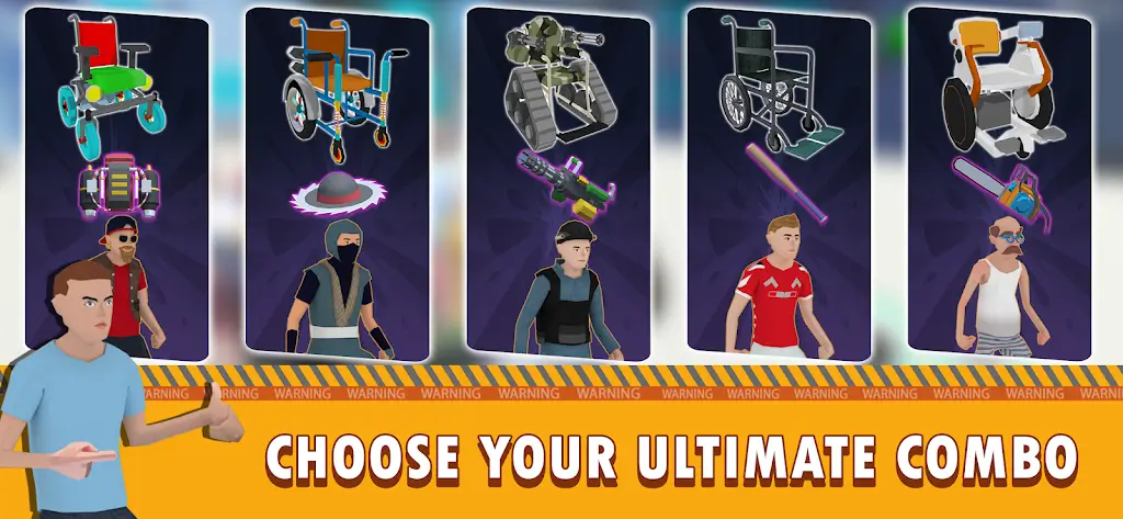 游戏的画面风格独特,轮椅上的角色和武器细节表现生动,场景氛围紧张刺激。配合环绕音效和背景音乐,轮躁大乱斗成功营造出逼真且充满激情的战斗环境,使玩家在游戏中仿佛置身于一场激烈的街头乱斗,沉浸感十足。