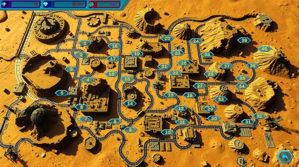 《坦克战区》的地图设计充满未来感和火星地表特征。地图颜色以红棕色和暗橙色为主,模拟火星的荒漠地貌。地貌中穿插着火山口、裂缝和岩石障碍,形成丰富多样的战斗环境。每一关都配置了不同的地形布局,既增加了探索性,也带来了不同的战略考量。每张地图中基地位置固定,保卫基地成为玩家行动的核心。地形变化和障碍设计促使玩家必须灵活调整走位与战术规划。
