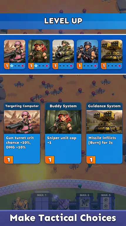 闲置守卫:军事塔防引入了策略深厚的卡牌系统,玩家通过每一波敌人的胜利,可以从随机卡牌中进行选择升级。卡牌不仅能带来基础能力提升,如伤害增加、暴击率提升,还能解锁特殊技能,包括穿透射击、范围爆炸和连击触发等玩法。卡牌间的协同作用使得每场战斗都有不同的策略组合,增强游戏的重复可玩性和策略挑战性。没有两场完全相同的战斗,让玩家不断体验创新玩法。