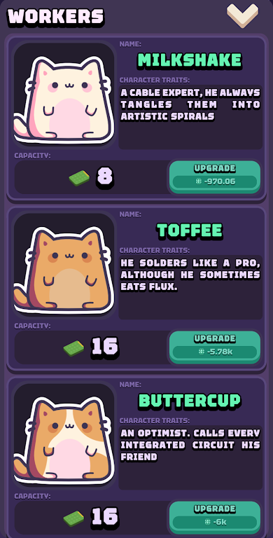 《猫和扳手》采用经典的放置游戏玩法,即使在离线状态下,生产线依旧自动运转,为你积累财富。这种轻松休闲的游戏机制让你无需时刻盯着屏幕,也能感受到工业帝国逐渐壮大的成就感。合理调配资源和升级设备,是确保收益最大化的关键。